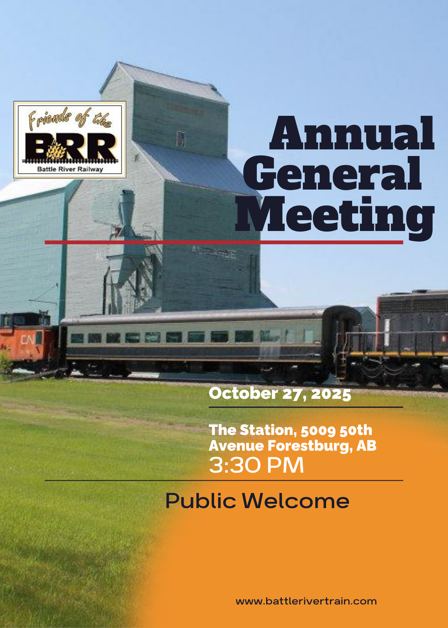 If you are interested in learning more about Friends of the Battle River Railway, then this is the meeting to attend. So save the date, and join us at The Station on Monday, October 27th, 2025 at 3:30 pm.